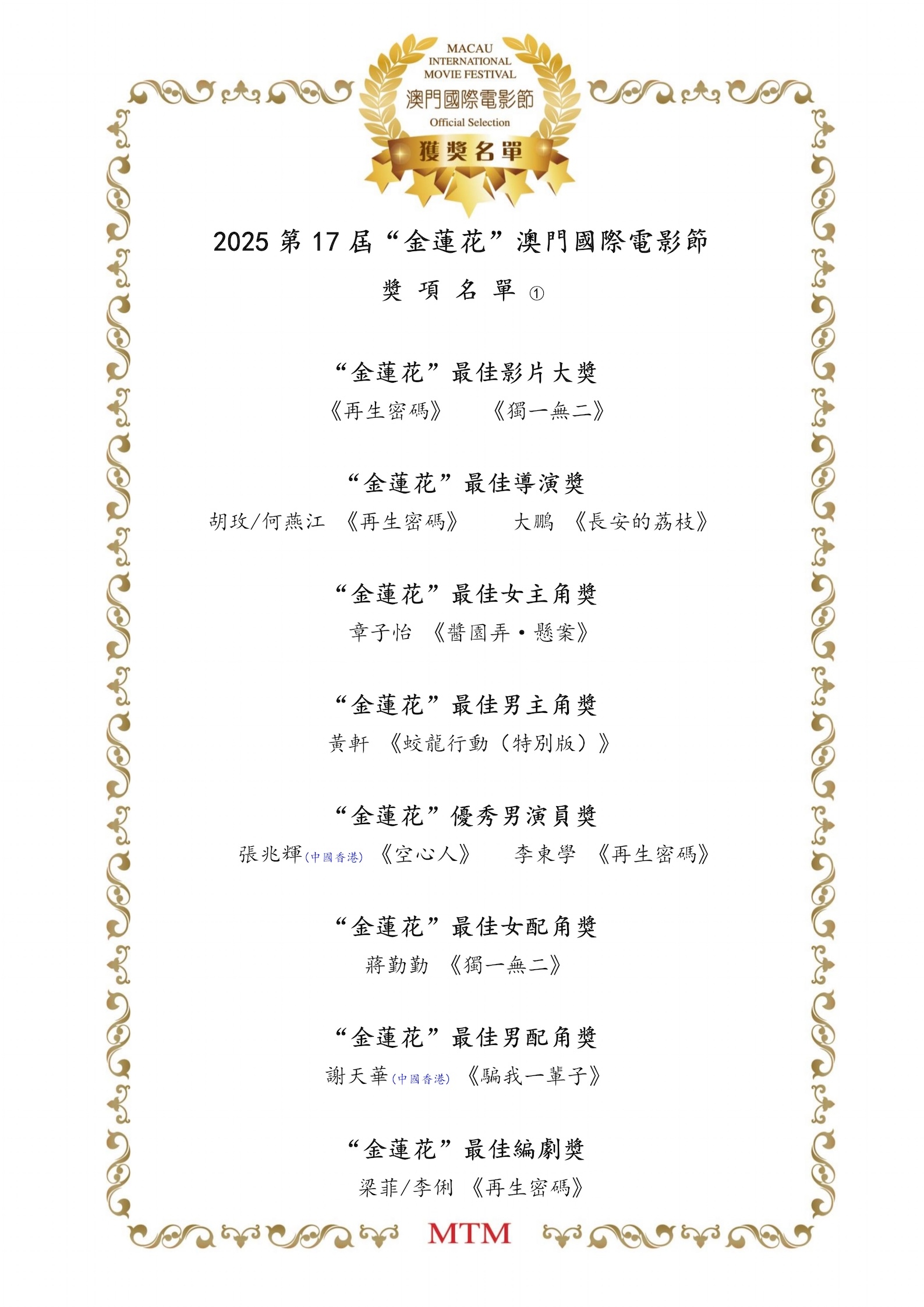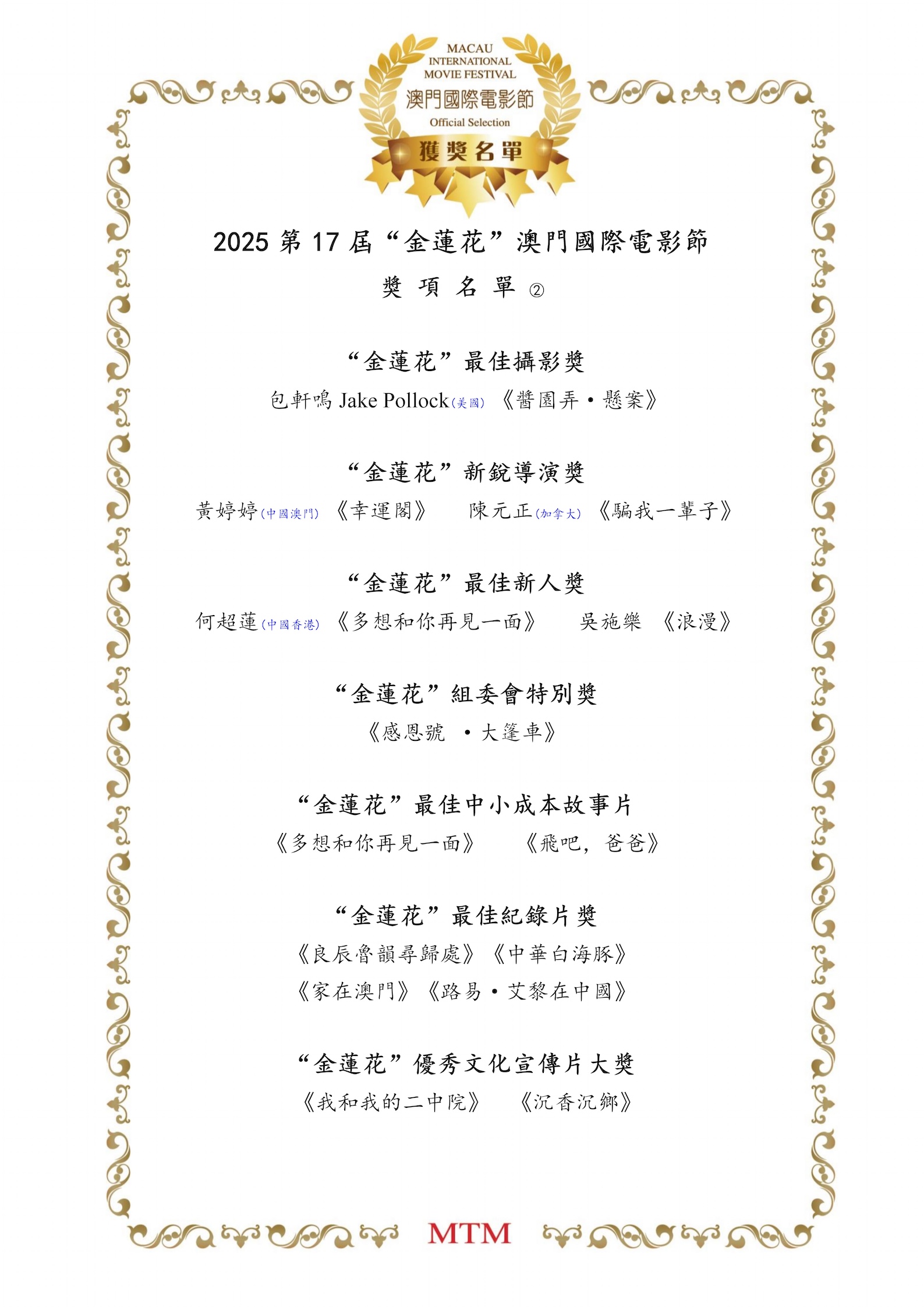 2025年第17屆澳門國際電影節獲獎者