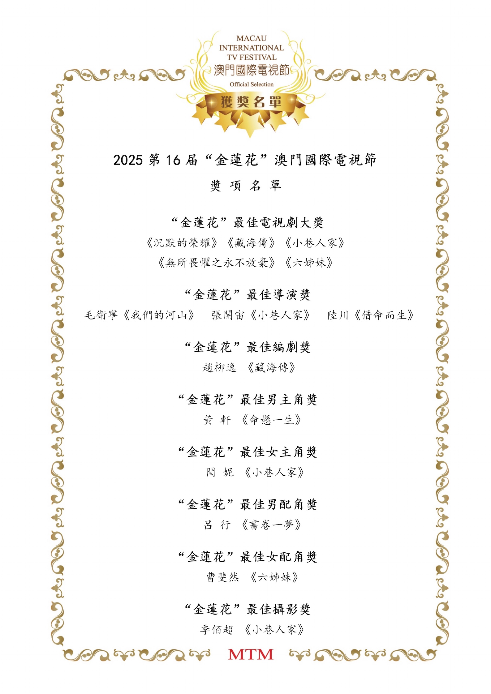 2025年第16屆澳門國際電視節獲獎者